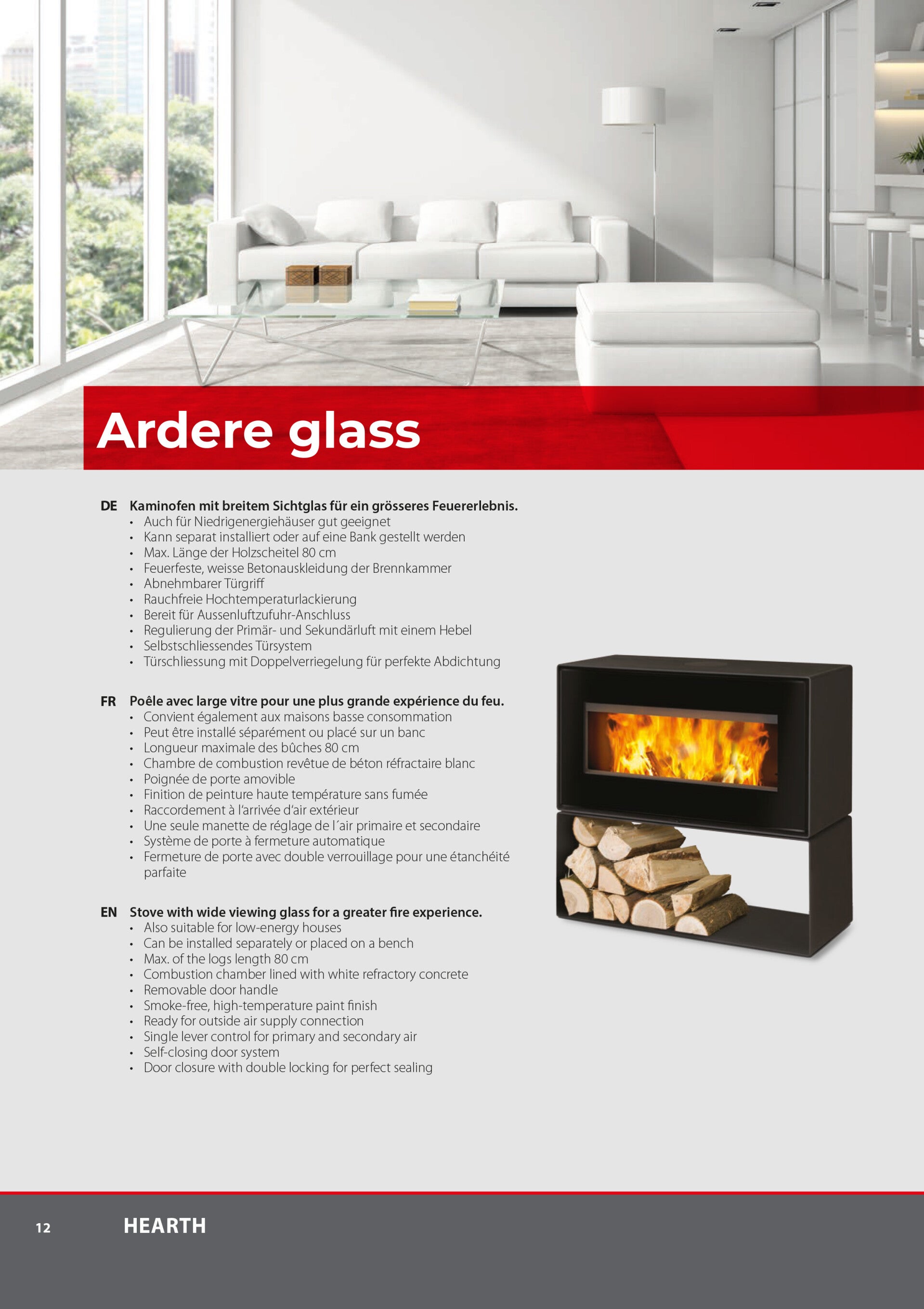 Kaminofen mit breitem Sichtglas für ein grösseres Feuererlebnis.